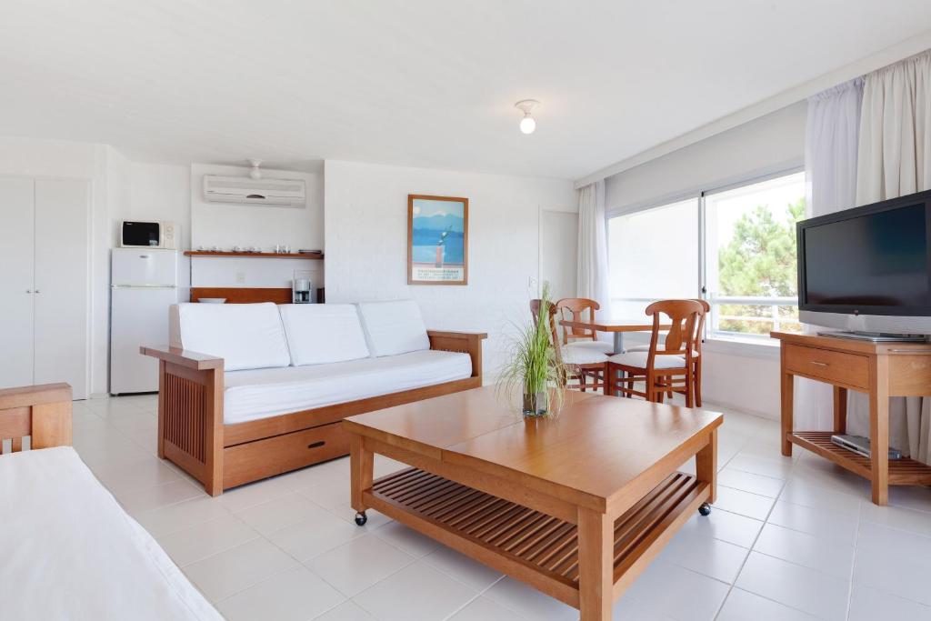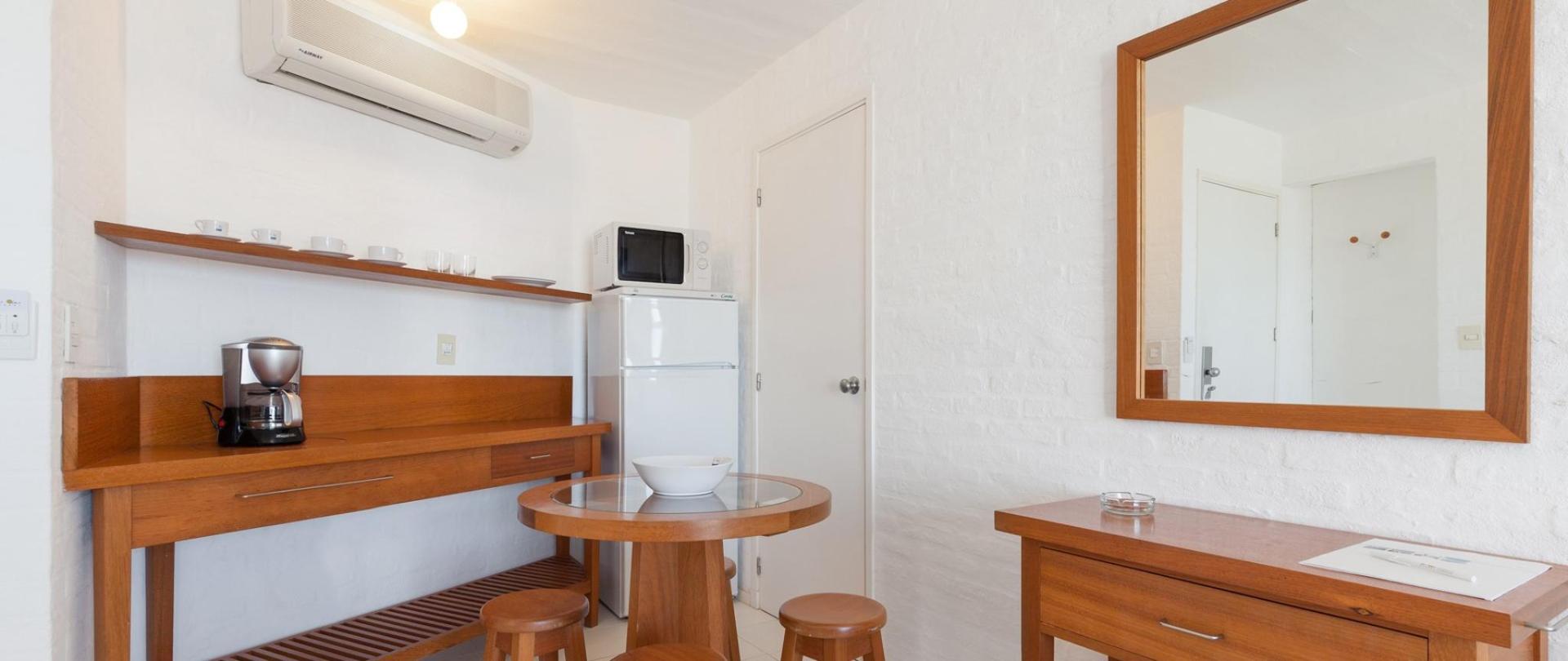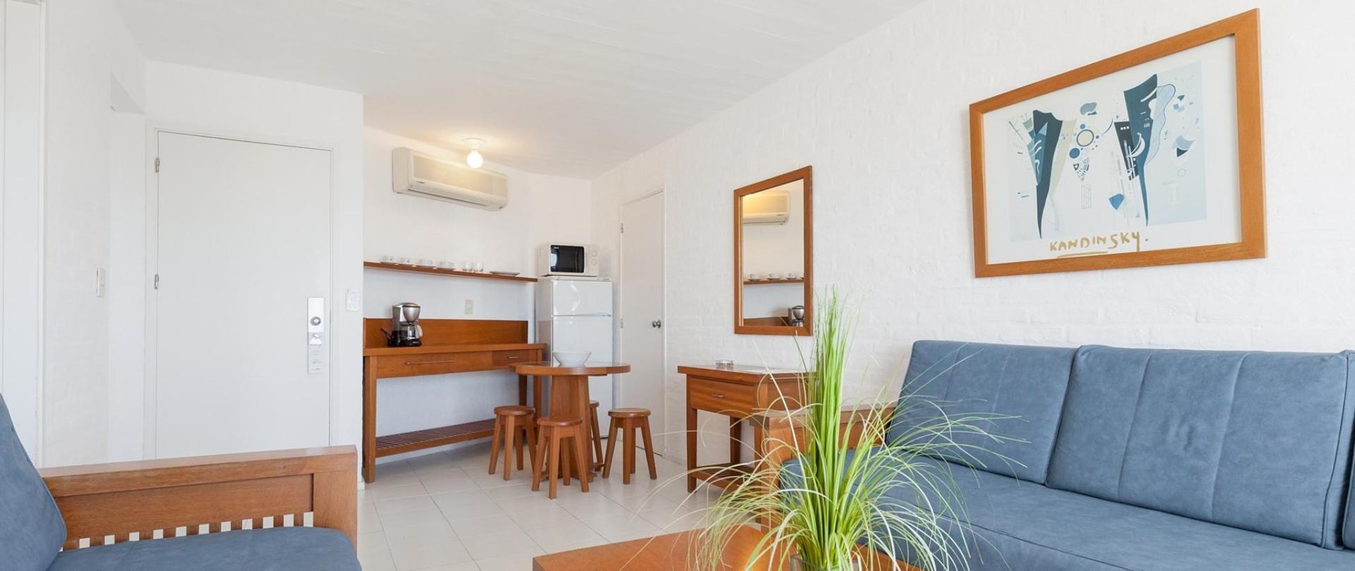 Las suites están distribuidas en dormitorio y baño completo, amplia zona de estar con sofá cama, totalmente equipadas con heladera con freezer, horno microondas, cafetera, jarra eléctrica y tostadora (no cuenta con fuegos ni lavabo). Aire acondicionado individual en cada ambiente, televisión con Cable y cofre de seguridad de apertura digital.